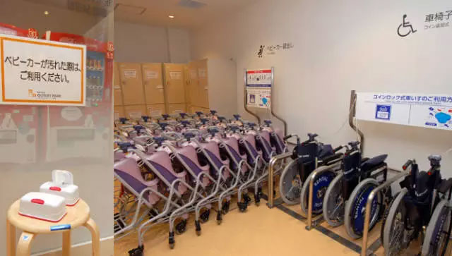 ↑為帶孩子和身體狀況不佳的顧客準(zhǔn)備的嬰兒車(chē)和輪椅設(shè)置于大門(mén)的入口附近,下車(chē)即可利用,最大限地減輕特殊顧客的體力負(fù)擔(dān)。旁邊放著消毒紙巾,用于擦拭嬰兒車(chē)。