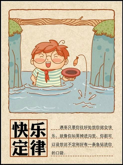 遇事只要你往好處想你就會(huì)快樂,就像你如果掉進(jìn)溝里,你都可以設(shè)想說不定剛好有一條魚鉆進(jìn)你的口袋。
