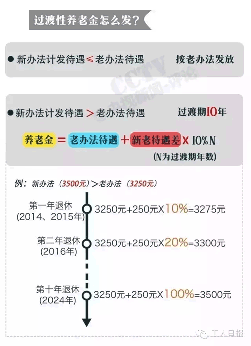 對于2014年10月1日前(簡稱改革前,下同)參加工作、改革后退休的“中人”設立10年過渡期,過渡期內(nèi)實行新老待遇計發(fā)辦法對比,保底限高。過渡期結(jié)束后退休的人員執(zhí)行新辦法。
